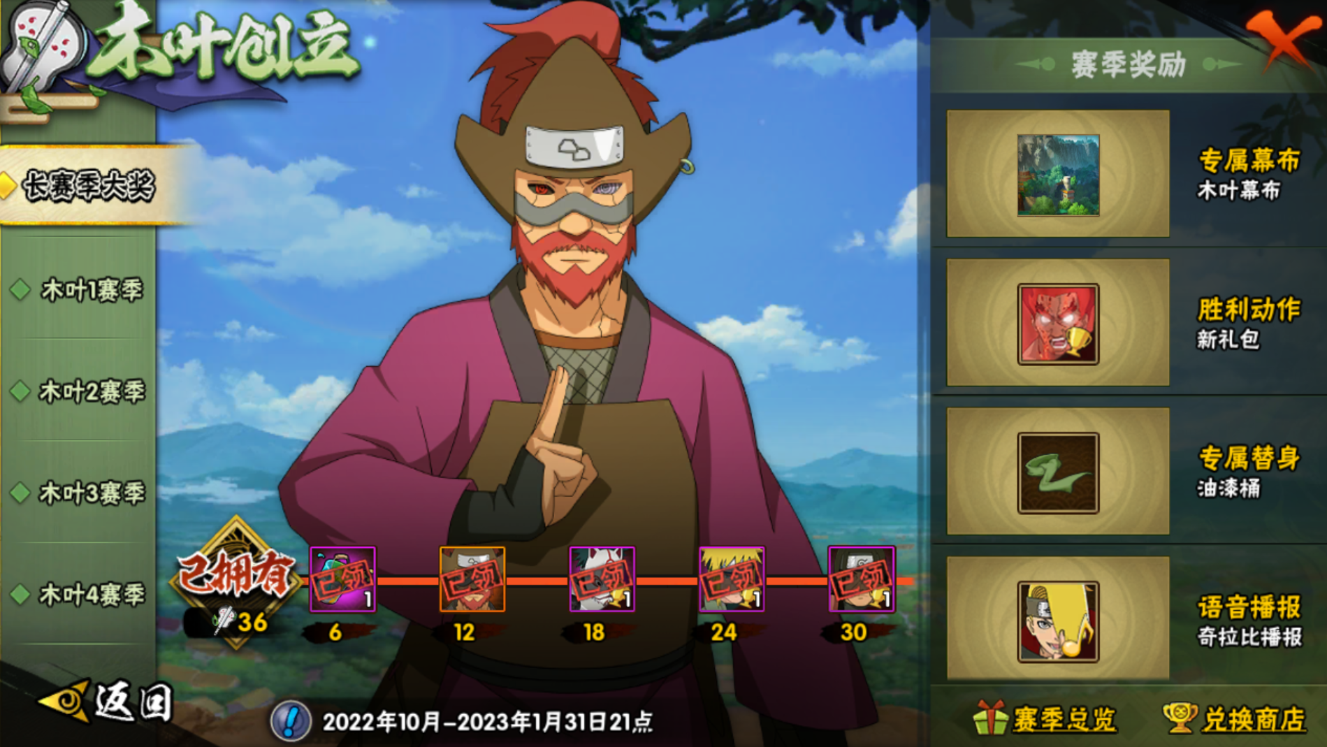说完了新佩恩六道汉,再来说一下全新赛季中的其他奖励,比如决斗场幕布、替身道具以及忍者的语音这些都是常规内容了。除了决斗场幕布暂时无法在游戏内看到,另外几个奖励都已经展示出来了,分别是围巾替身道具以及迪达拉的语音,还有死门凯等忍者的胜利动作。只不过更新不完全,文字描述还是老版本的,大家知道大概的内容就行。因为忍战大野木是岩隐村的角色,所以,下个赛季的决斗场幕布肯定也是岩隐村的效果。