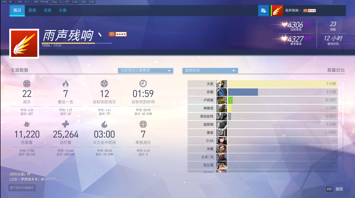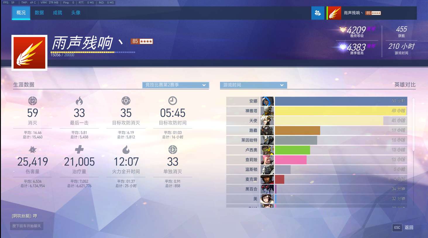第一个赛季主玩毛妹和路霸,第二个赛季开始修炼辅助,主修天使、安娜、和尚,玩了至少有200个小时的天使,在赛季结算的最后两天成功打进了国服天梯的前100,生涯最高打到4383,第三个赛季定级4000分,