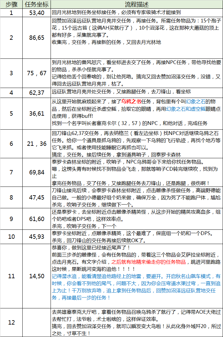 在接小德大鸟飞行任务前,记得先去影月谷的蛮锤要塞把大鸟骑术给学习了,也就是专家级骑术,要不然是接不到任务的。接下来看表格图吧。