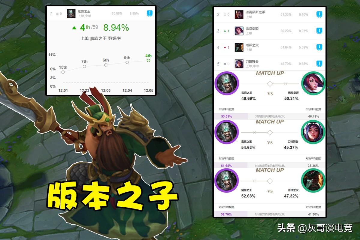 说出来大家可能不信,自从战士装备改版后,蛮王已经连续两个版本登顶上路了,根据对位数据显示,除了诺手之外的其他三位T1上单均是蛮王的手下败将,另外像男枪、贾克斯、杰斯这些路人局中比较热门的英雄他也可以轻松应对。在占据“上路克制链”顶端的同时,蛮王的上手难度还不高,因此便有越来越多的玩家开始练习这个英雄,登场率相较赛季初已经翻了近一倍。