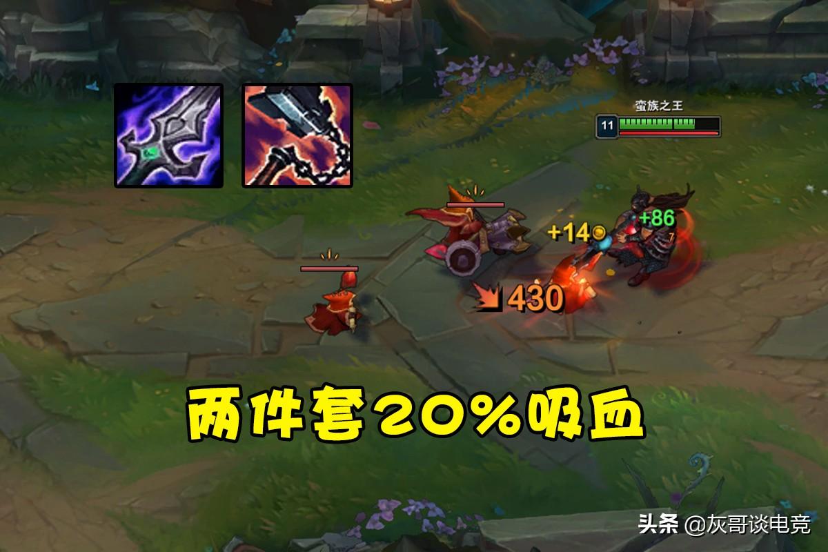 今天灰哥要给大家推荐的“嗜血流”蛮王,它同时兼顾了单带、对线和团战,核心装备是破败与渴血战斧,在此前的战士装备改版中,这两件装备的伤害均得到提升(破败2%额外伤害、渴血战斧10点攻击力),裸破败有攻速、有续航,有单杀能力,补出渴血战斧后吸血属性提升至20%,此时蛮王的赖线能力堪称无解,对线时可以先手E技能近身与对手换血,第二个E技能刷好的同时配合渴血拉开,接着只需要一波兵就能把血吸满,如果对手是一个缺乏回复能力的英雄,蛮王就可以反复利用这套连招将其耗回家然后再拆塔。