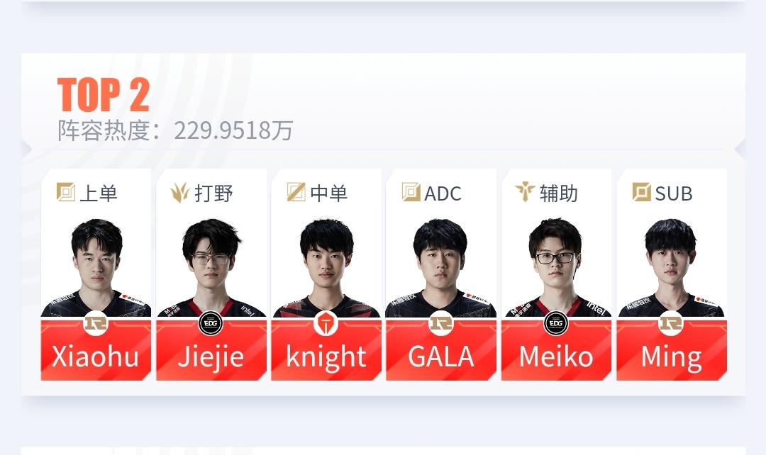 前段时间有一个英雄联盟活动,选出你心目中的亚运会队伍。可以看到目前最火热的队伍构成是上单xiaohu,打野jiejie,中单knight,下路gala,辅助meiko,替补ming。