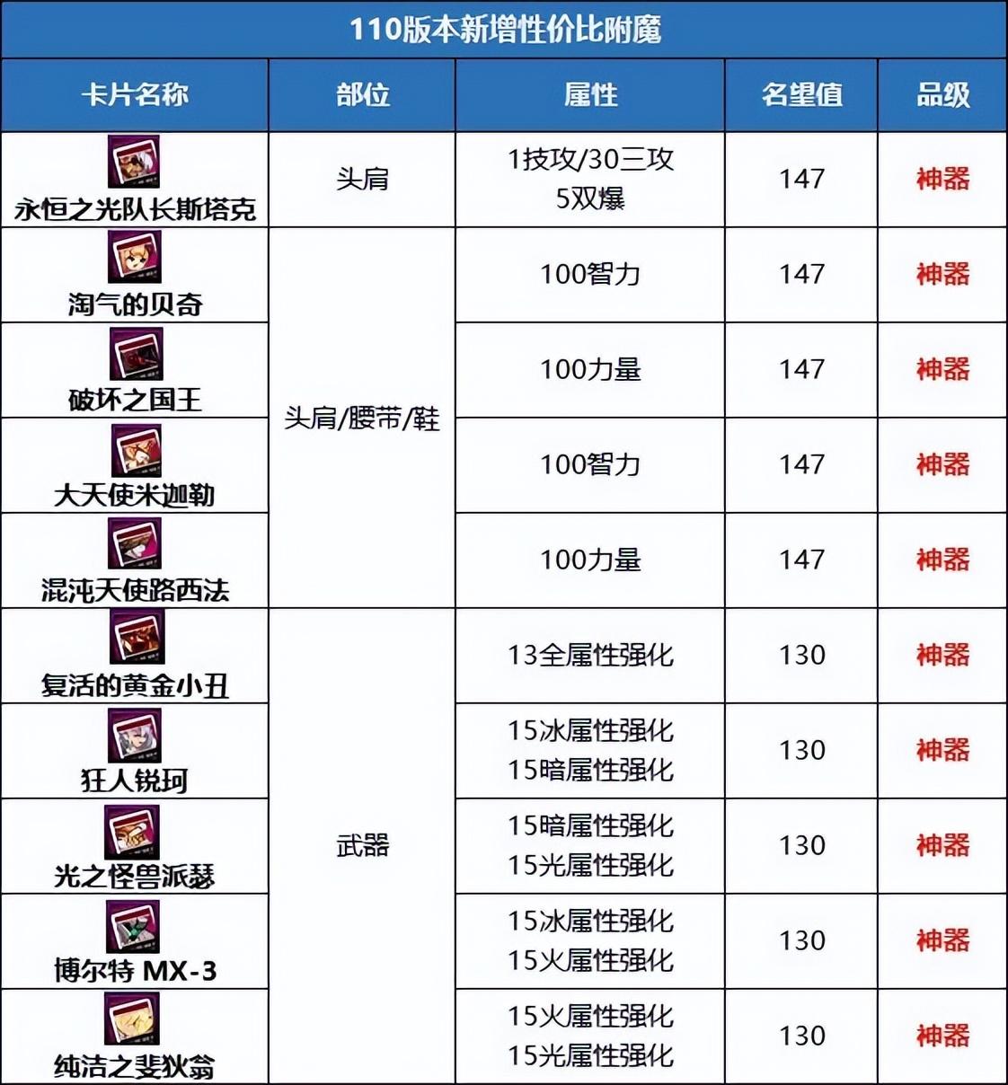 这就导致了地下城中产出的神器卡片价格的下降,而这些卡片正是我们需要的,能在提升名望的同时带来可观的伤害提升。下面就来盘点一下新版本的神器附魔: