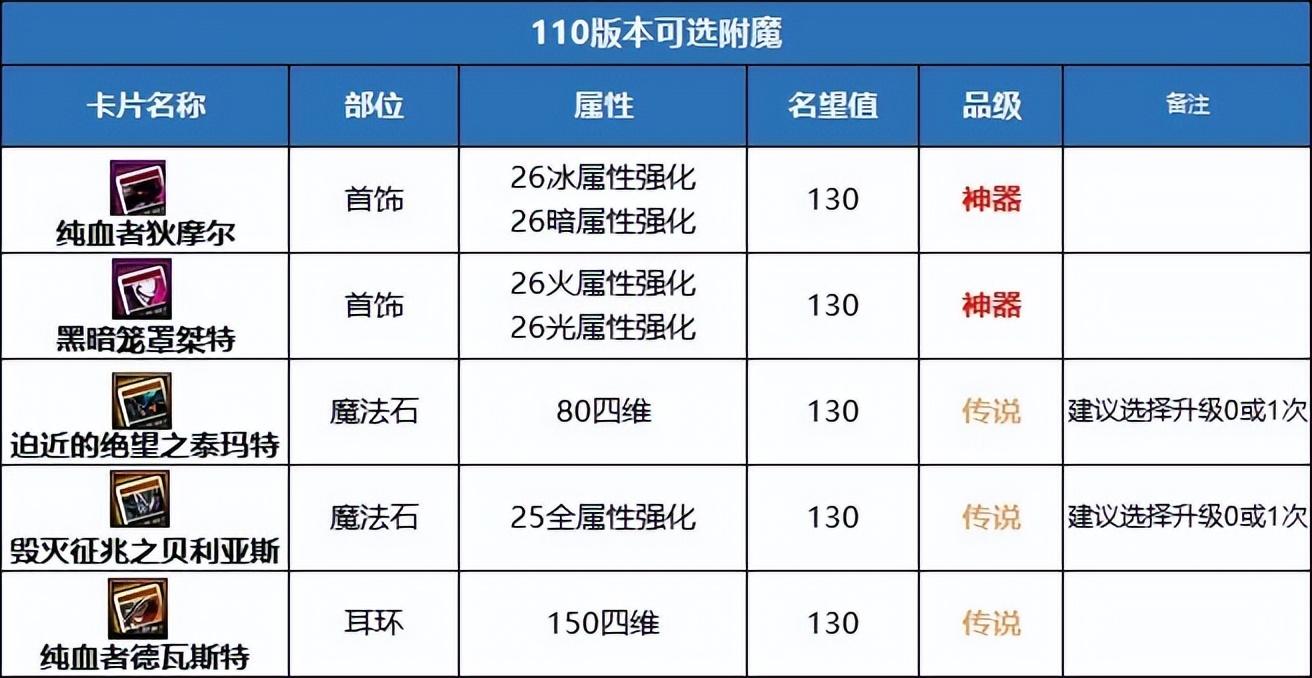 以上便是110版本新出现的神器附魔,价格实惠,且名望提升高。特定部位在没有节日宝珠时可以说是不错的选择。