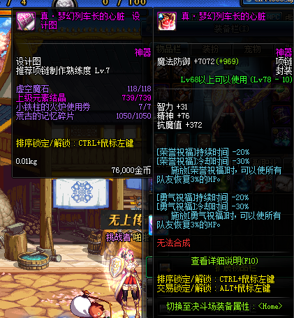 再来说下另外一个材料,荒古记忆碎片这个材料很多人都不知道这玩意除了能用来换传说装备还能用来干嘛,在这里我就来告诉你们一个换钱的方法,就是赚奶妈的钱!用这个真.梦幻列车长的心脏设计图。设计出来就能赚!我来给你们算下设计图的成本.118个虚空魔石*1670单价=19.7w 739个上级*750单价=55.4w 小铁柱的火炉使用卷7张*100w单价=700w 设计图拍卖行是620w 全部加起来=1395w成本 。