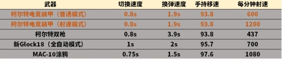 小结:虽然是一把半自动武器,但射速非常快,普通模式射速远超原版,射速模式则一跃成为当前射速最快的手枪。当然这并不意味着你1秒要扣20下鼠标:在射速模式下,每按下一次左键,两把手枪都会同时开枪。也就是说和普通模式一样:1秒10下鼠标即可。