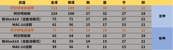 小结:影响威力的两个指标:距离修正和护甲修正都有一定的强化,作为一把高射速手枪拥有如此威力实属难得,但是面对常规竞技模式主流的手枪仍有一定差距。
