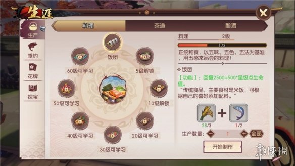 3、我们会进入到下图显示的全新界面,左侧列表第一个便是“生产”功能,玩家可在该功能生产食物。选择我们要生产的食物,最后点击右下角角的“开始制作”方可完成生产