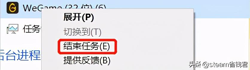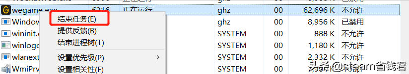 打开任务管理器,找到wegame,右键点击“结束任务”彻底关闭wegame。