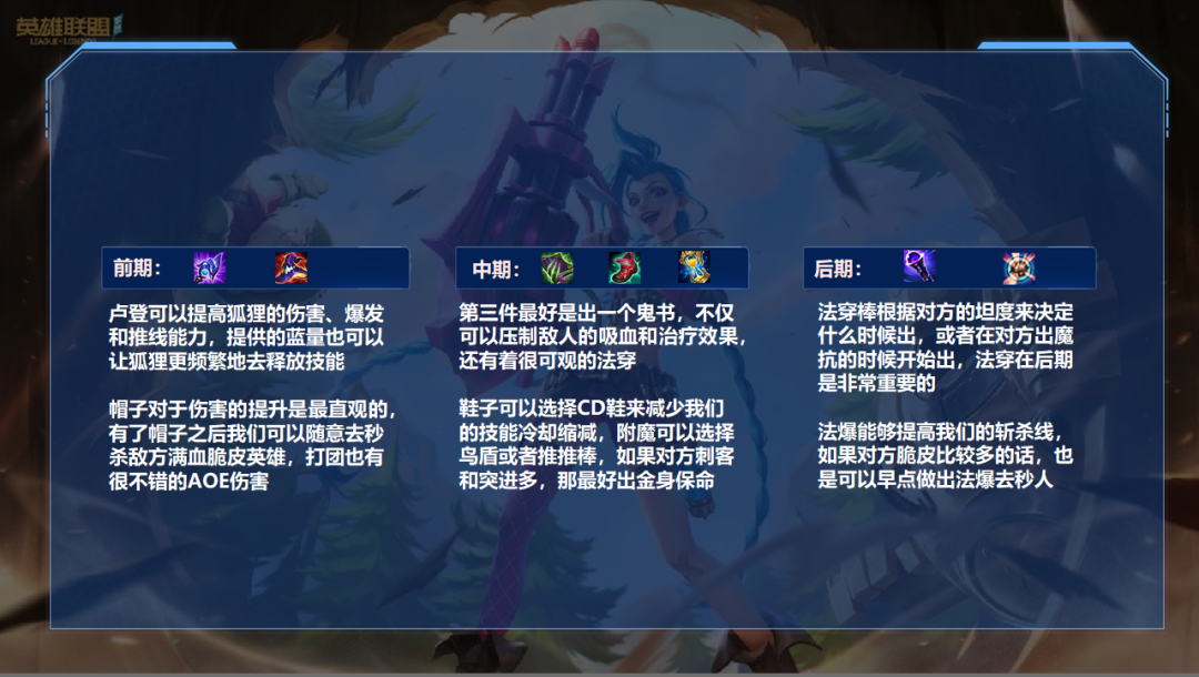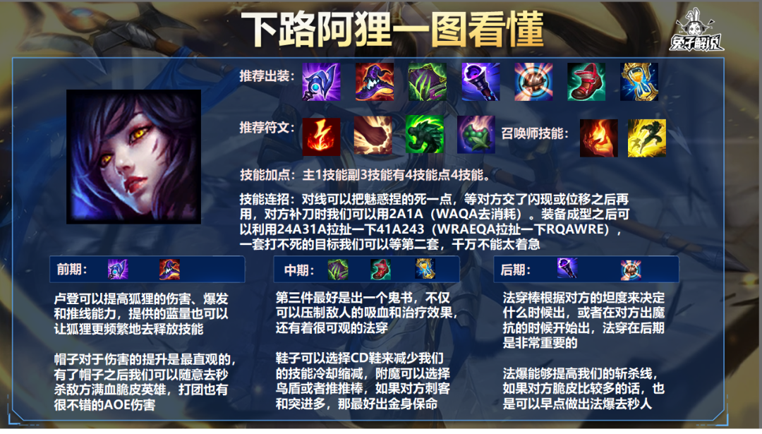 阿狸的出装比较简单非常好理解,因为目前法师的装备并没有太多的选择,基本上换来换去也就时光和卢登的两种玩法,卢登追求爆发和伤害,时光为了容错和持续输出能力。不过如何选择还是需要根据英雄来决定,有的英雄两种都可以选择,而有的只能选一种,如果出错装备前中期会很刮痧,基本看不到后期,所以我们千万不要乱出装备,很容易葬送自己的优势。