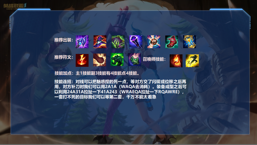 对线可以把魅惑捏的死一点,等对方交了闪现或位移之后再用,对方补刀时我们可以用2A1A(WAQA去消耗)。装备成型之后可以利用24A31A拉扯一下41A243(WRAEQA拉扯一下RQAWRE),一套打不死的目标我们可以等第二套,千万不能太着急