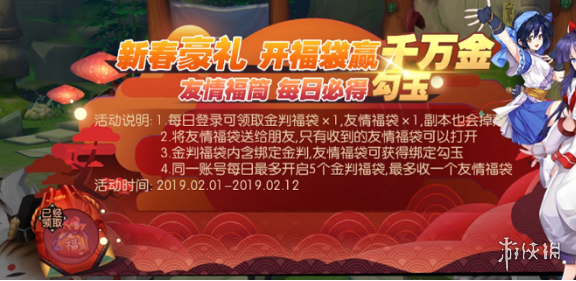活动时间:2019年2月1日至2019年2月12日。每天登录可以领取金判福袋1个、友情福袋1个,副本也会掉落。将友情福袋送给朋友,只有收到的友情福袋可以打开。