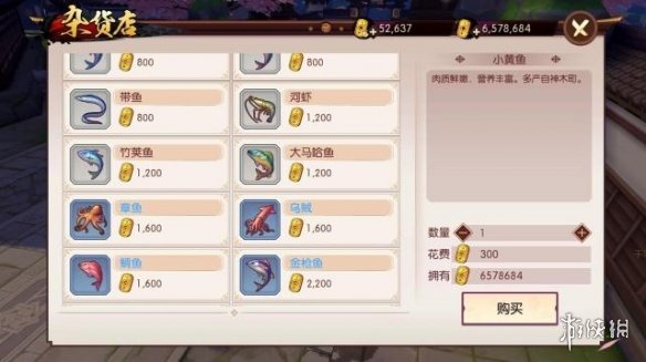 打开售卖界面会发现,这里什么鱼类都有,无论是低级的秋刀鱼、螃蟹还是高级的石斑鱼、河豚应有尽有。每种鱼类的价格也是不一样的,低等级鱼类相对比较便宜,例如50级料理寿喜锅所需的螃蟹只有500金判一只,40级天妇罗所需的河虾价格为1200金判,相较于交易行中的鱼类价格几乎不差什么。