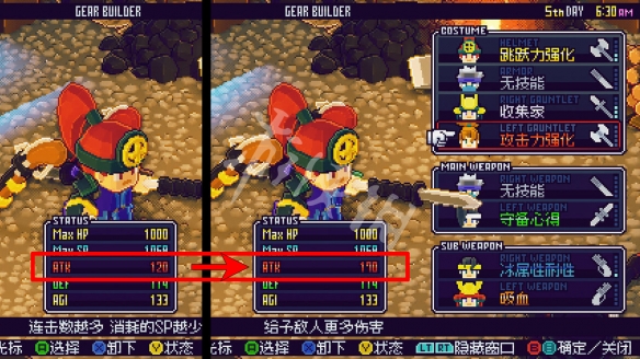能看到装备最右边的五个像素了吗?这其实是装备的强化值,将强化后的武具作为防具装备就能提升防御力和敏捷度,作为武器装备就能提升攻击力。