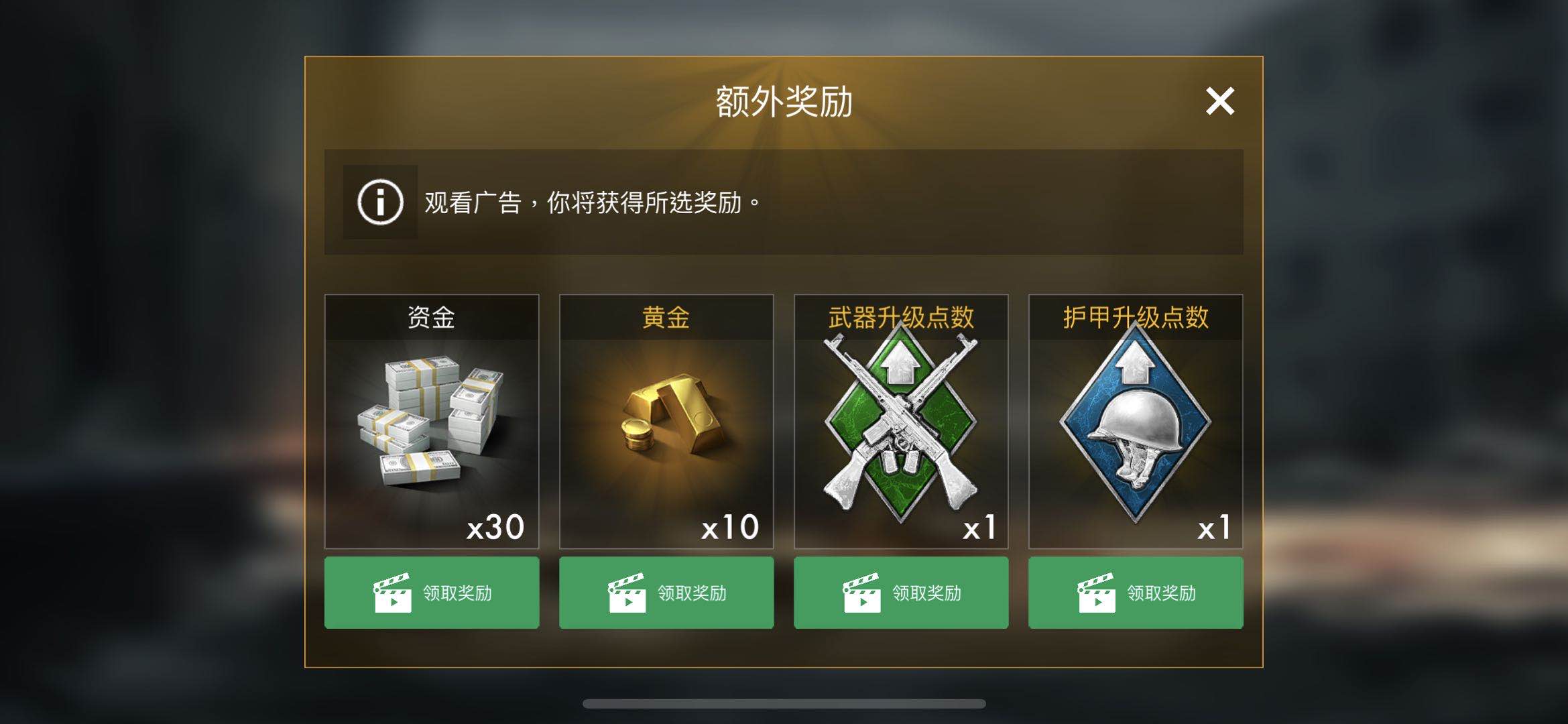 游戏里的广告每看一次都是可以获取到相应奖励的。广告也分为两种,一种是强制广告,看完以后会奖励给大家一定的道具,其中就有黄金奖励。