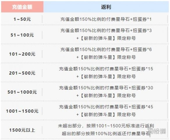 玩家在测试期间充值任意金额,在公测时根据您充值金额所处的档位,可以获得相对应的一份丰厚返利。(每名玩家总计只能在一个档位内获得返利,各个档位返利不叠加),详细返利规则如下: