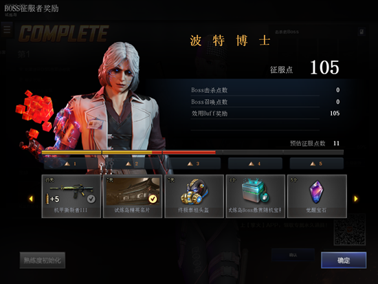 试炼岛的征服点由三大部分组成,分别是BOSS召唤点数、BOSS击杀点数和效用BUFF奖励。前两者只需要组队不停召唤BOSS刷就完事了。至于效用BUFF奖励,须在演武广场、破旧庭院、水下实验室这三大区域,分别将跳跃鞋、潜水服和加速器都刷到20个,因此最好在这三个区域都刷一段时间。
