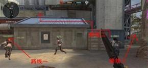 在这三条路线中,路线一、路线三都是进攻路线,不可避免地将与守卫者发生正面冲突。路线一的地形对突击者较为不利,往A点可能被守卫者居高临下、抢得先手,往B点则受制于小房间,要小心手雷的威胁。选择路线三,双方将正面爆发冲突,这里双方在地形上没有明显的优劣势区别,关键在于谁的枪法好,不过突击者在突破以后不光要注意正面的敌人,小心守卫者从左侧建筑二楼发动偷袭。路线二属于支援路线,既可以根据形势快速支援路线一、路线三中压力较大的一路,也可以选择与其中一路的友军配合,一鼓作气将敌人的阵型击溃。