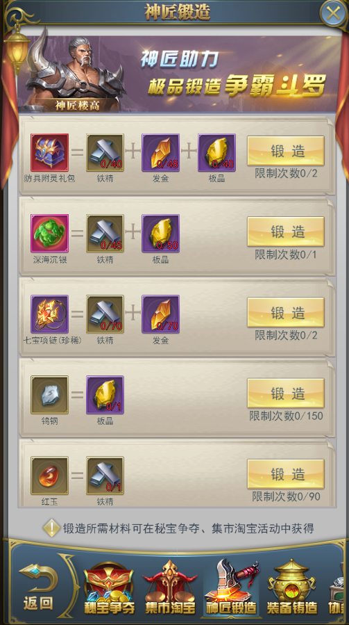 铁匠协会限时特供,玩家可低价购买更多秘钥,开启神匠秘宝获得珍稀矿石材料。