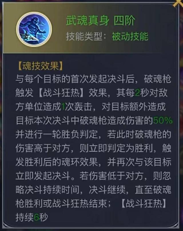 新武破魂枪关键点在于决斗是否被判定为胜利,由于这个设定,这个武魂不再适用于藏核玩法,因为想让破魂枪获得决斗的胜利,伤害就要足够。