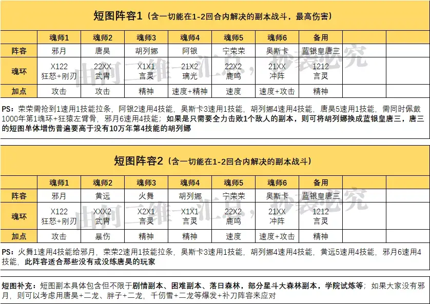 首先我们来说短图方面的最高效阵容,目前在短图方面最强力的阵容便是邪月+唐昊+胡列娜+阿银+宁荣荣+奥斯卡的阵容,其中对于部分只需要击败单人boss即可通关的副本来说则可以考虑将胡列娜换成蓝银皇唐三。