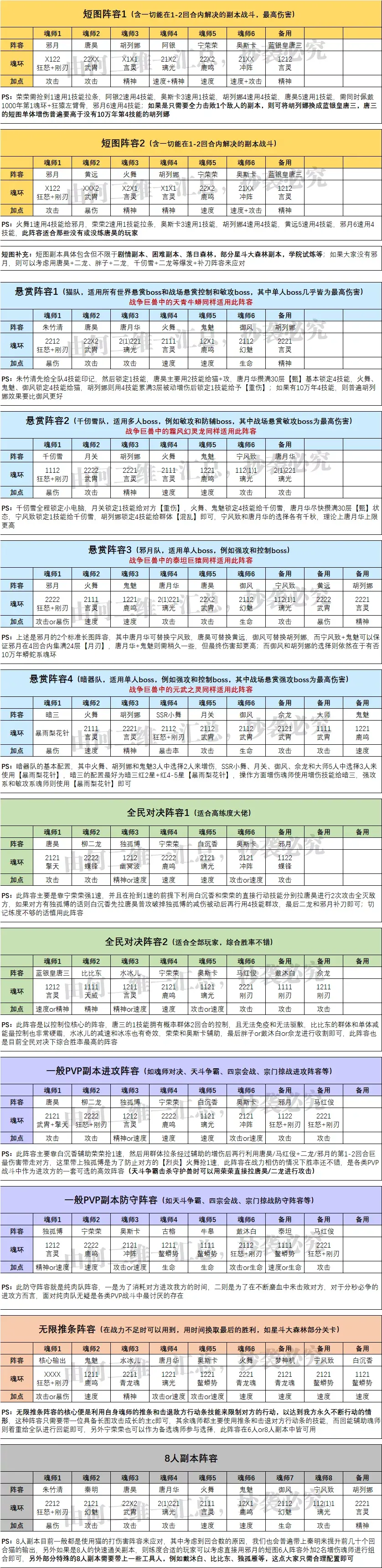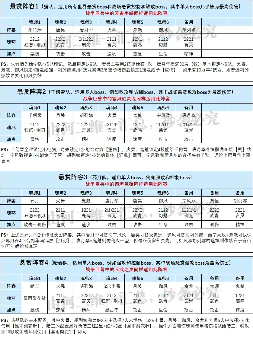 暗器队:适用单人boss,例如强攻和控制boss,其中战场悬赏强攻boss为最高伤害,战争巨兽中的元武之灵同样适用此阵容