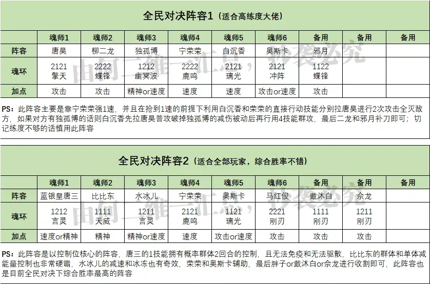 唐昊的队伍比较适用于有不错魂骨、魂环积淀的高练度大佬,这个阵容的特点就是打的快,同时上分也快(此阵容主要是靠宁荣荣强1速,并且在抢到1速的前提下利用白沉香和荣荣的直接行动技能分别拉唐昊进行2次攻击全灭敌方,如果对方有独孤博的话则白沉香先拉唐昊普攻破掉独孤博的减伤被动后再行用4技能群攻,最后二龙和邪月补刀即可)