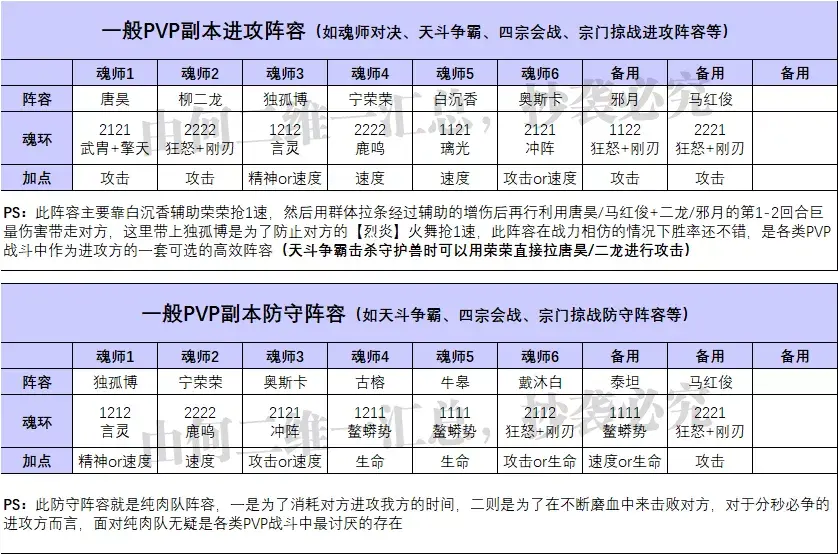接着是在魂师对决、天斗争霸、宗门掠战和四宗会战等PVP玩法里的进攻阵容和防守阵容: