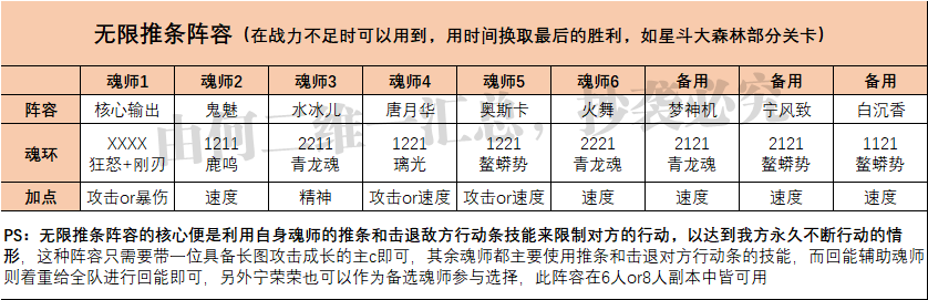 接着我们看到的是无限推条流阵容,这个阵容的班底在星斗大森林里的霜风幻灵龙、天青牛蟒、元武之灵和琉璃七玄鹿上都有非常好的表现,如果你的战力不够却又想通关的话,无疑无限推条流便是你最好的选择,另外如之前才刚刚完结的【我道狷狂】8人副本,大家练度不够又想通关的同样可以采取无限推条的打法,并且8人的无限推条对比6人阵容会更加稳健高效。