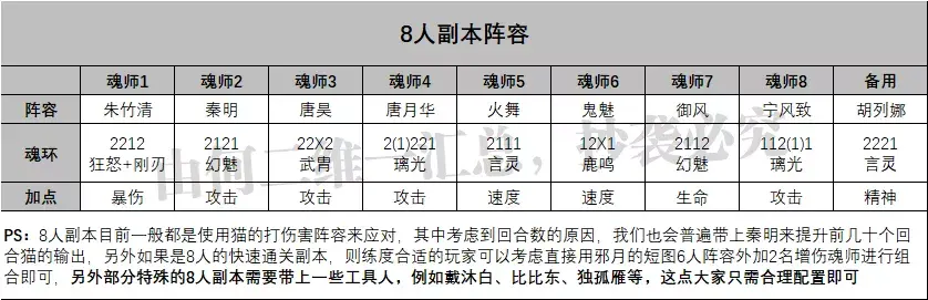 今天最后看到的便是8人副本的阵容班底了,目前绝大部分的8人副本都是由猫队来负责处理的,而猫队的8人阵容便是在6人阵容上增加2位增伤魂师即可,其中我们普遍会带上秦明来提升前几十个回合猫的输出,另外如果是8人的快速通关副本,则练度合适的玩家可以考虑直接用邪月的短图6人阵容外加2名增伤魂师进行组合即可,最后部分特殊的8人副本需要带上一些工具人,例如戴沐白、比比东、独孤雁等,这点大家只需合理配置即可。