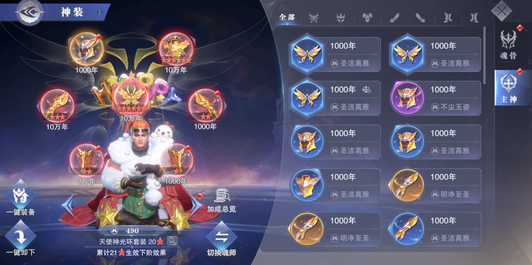 接着是魂师的神装部分,这部分其实也会对星级、等级等因素有一定的要求,不过目前大部分玩家在这部分没有很好的基础,所以这里简单提一两句即可,按照维一5000万左右战力的评分来说,一个6星部分神装对比1星神装可以带来的战力提升大概在20万出头,这点差距大家也可以参考一下,另外神装的等级提升其实对整体的战力影响并不大,主要还是为了提升神位亲和度来激活对应的神位技能效果。