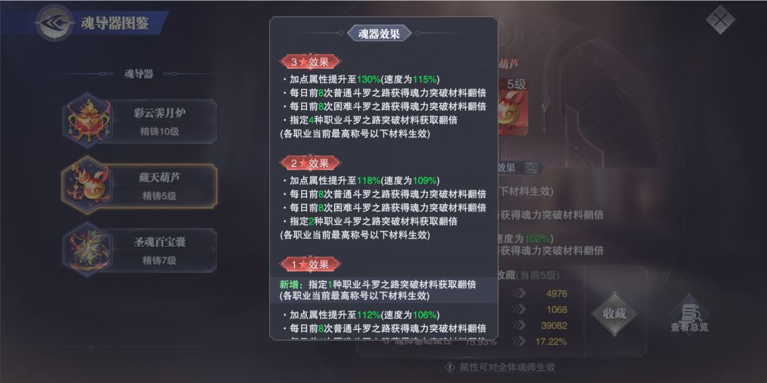 那么除了魂师部分外,部分的魂导器其实也是一个提升我们战力的重要来源,例如葫芦这个魂导器所带来的加点属性提升就能给到我们不小的帮助,并且其星级、等级越高所带来的提升越高,这也是大佬玩家和普通玩家的一个较大的战力差距点。