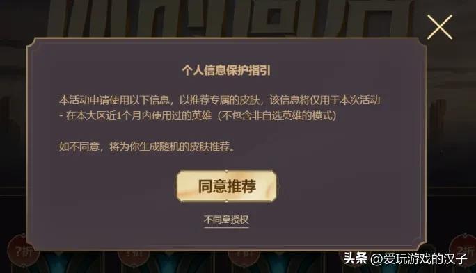 “同意授权”会显示近一个月内在自选英雄模式中使用过的英雄,“不同意授权”则显示随机皮肤.