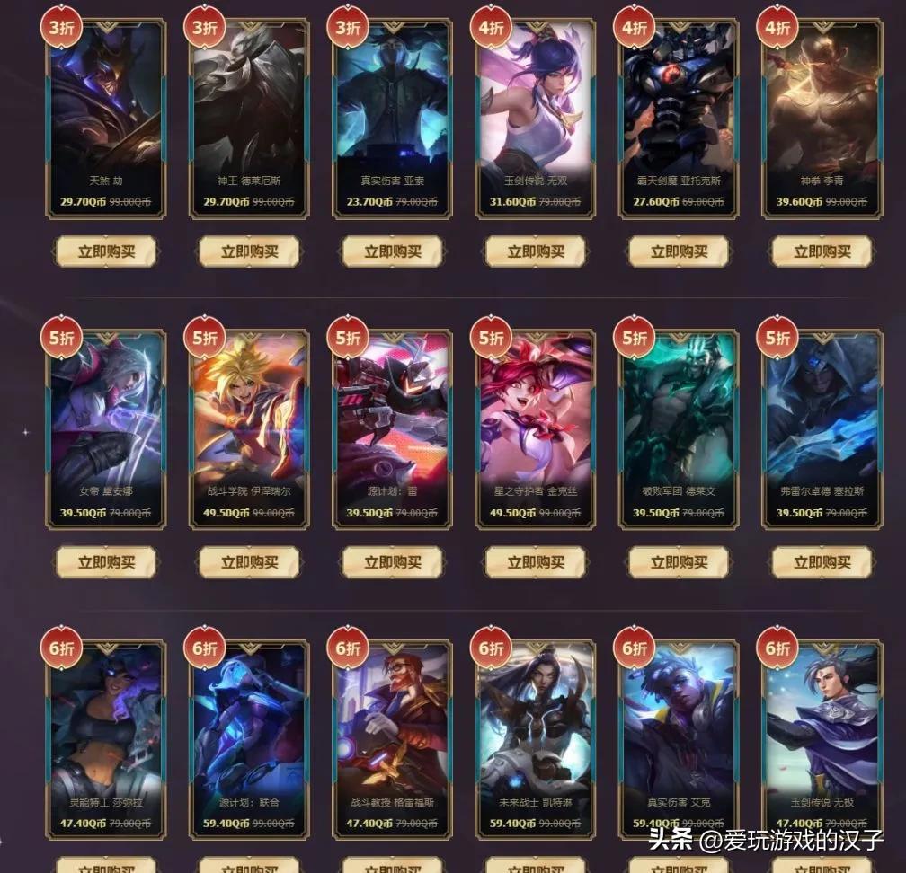 一共18个皮肤有折扣,3个三折、3个四折、6个五折和6个六折.