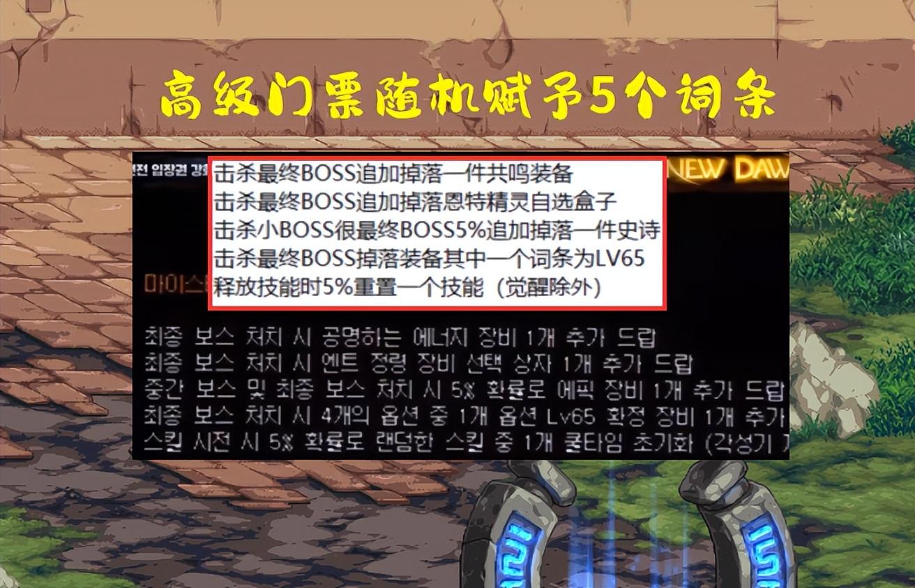 【3、高级地下城优化】,寂静城、机械战神等高级副本的门票,加入了一种“词条功能”,每次进入地下城的时候,门票都会随机赋予5个词条属性(类似于未央宫),比如增加史诗爆率、增加词条等级等,而其中最受期待的是,增加“自定义自选礼盒”!
