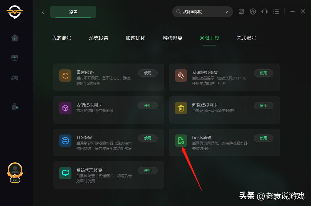 我们的Hosts文件如果被污染的话,也会导致我们的战网登录不上。这个时候就需要清空一下HOSTS文件,然后再登录战网就没问题了。不懂怎么清空的话,我们可以用奇游上的设置,里面有HOSTS清理工具,点击后就OK了。
