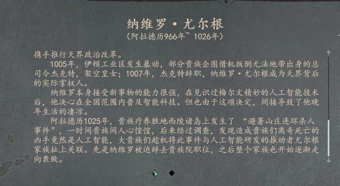 然后对于人工智能这里我再引申一点,机械二觉背景故事就是人工智能相关,官方把人工智能时代归为天界的第四个时间段。(前面有两次机械革命和和平发展时期)而尤尔根的事情,经议会多次讨论商定,于1026年正式对外颁布了“人工智能民用禁止令”。尤尔根家族也因为这次事件而走向没落。自此,智能时代的发展宣告结束。而智能时代的终结并不意味着天界进入倒退阶段,反而愈发呈现百花齐放、百家争鸣的形态。