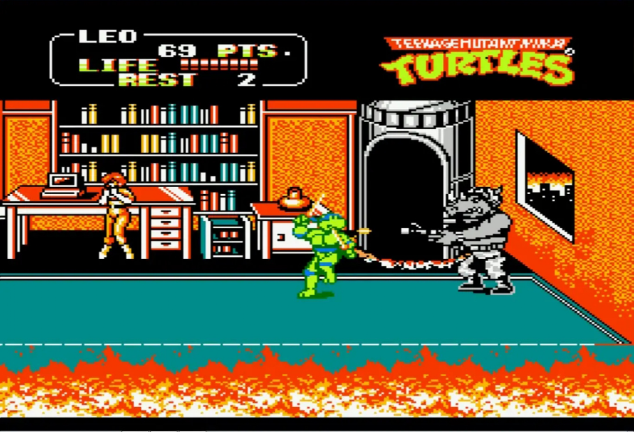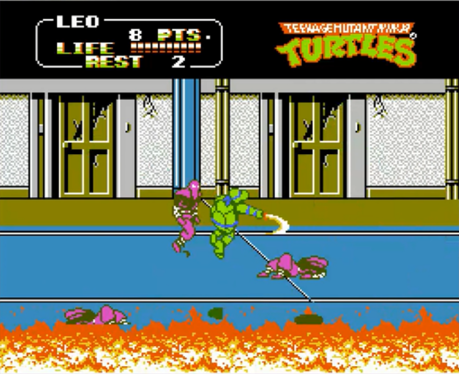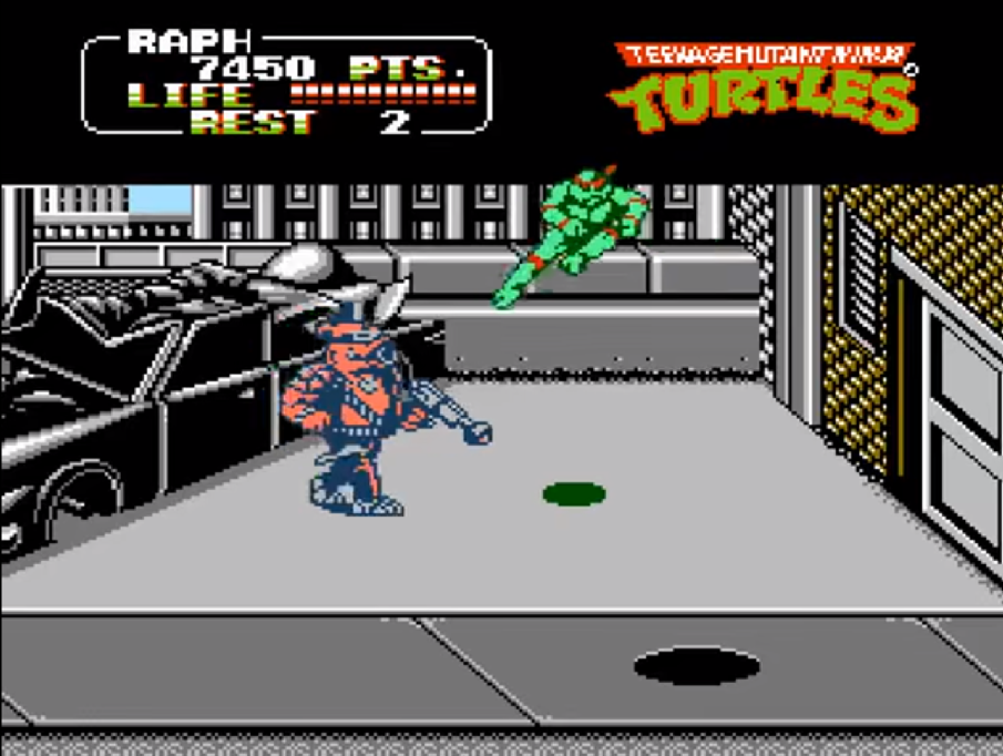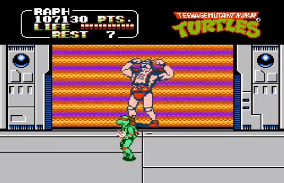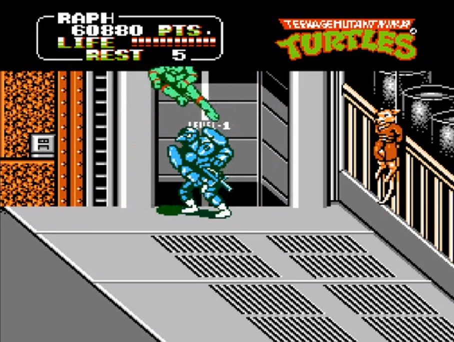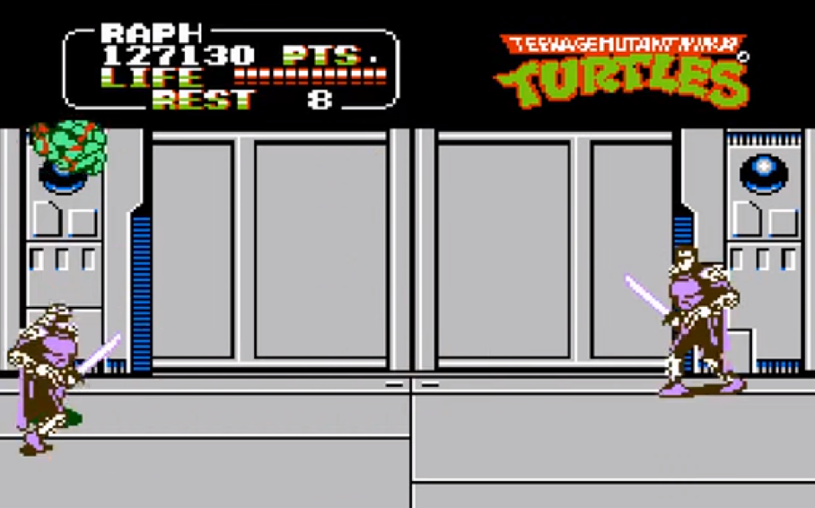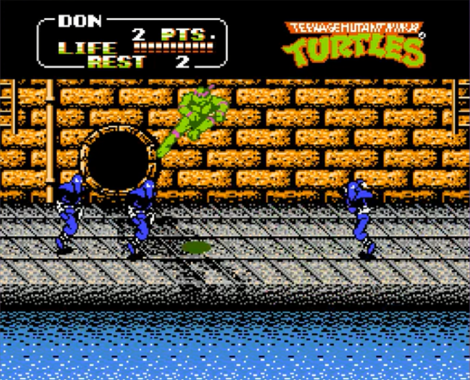 记忆中《忍者神龟2》卡位置BUG还存在另一个实用方式,就是瞬移——在同时按↑↓方向键时再按跳跃,就会一下向左上蹦,直接跳到屏幕最顶端。假如龟龟此次跳跃能到达屏幕最左端,那它会穿过左侧屏幕并从屏幕右端瞬间出现,有点《东方Project》老妖婆间隙的效果。要说这一招有什么实用价值?或许只剩下帅气了,有时也可以躲避杂兵的围攻以及BOSS的攻击。