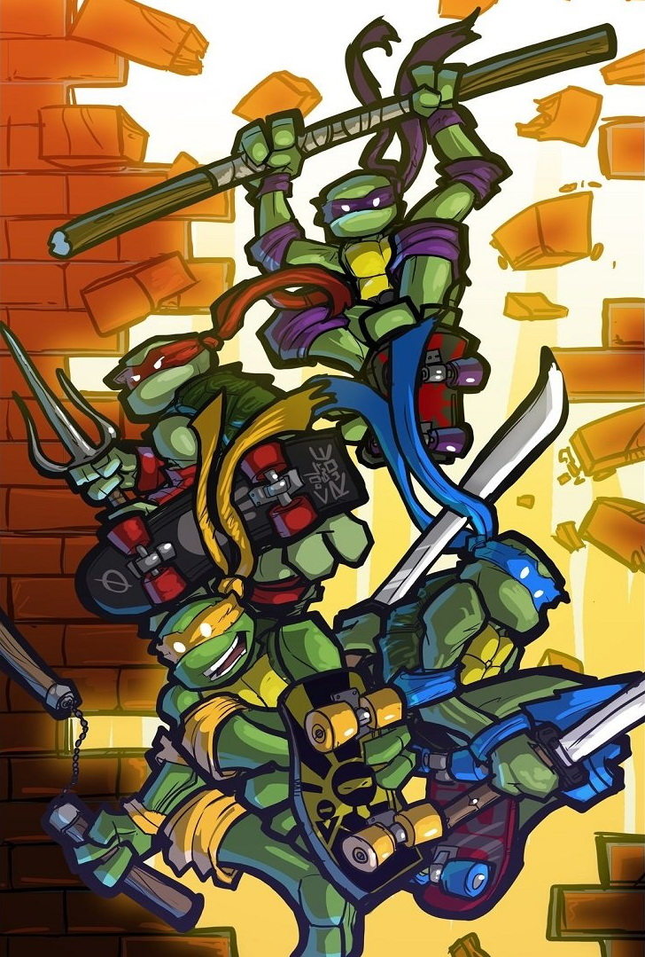 0年代两名青年漫画家“凯文·伊斯曼”和“彼德·拉特”百无聊赖地戳笔头,心中浮现非常喜爱的《X-MAN》《夜魔侠》等漫画人物及情节,手中的绘图笔信手画下了一个凶神恶煞大龟的形象。看着无意中创作的漫画人物,两人觉得这猎奇的形象还算可以,继续将其设定丰满起来,成为兄弟四人(龟?)的变异龟忍者,并推出了以其为主角的漫画作品,这就是风靡了上个世纪至今依然在推出电影和游戏作品的《忍者神龟》。