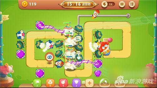 第10-16波的方法:阿波需要更精准的火力来消灭全图残余的障碍物!并继续增强全图的火力建设,萝卜丝们小心漏网的怪兽们偷到萝卜哟!