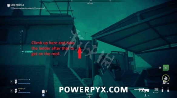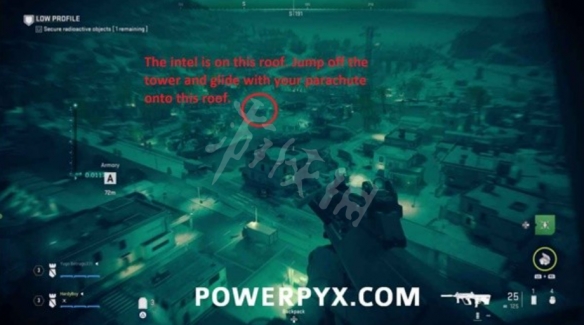 在目标B附近一栋房子的屋顶上,可以用房子里的梯子爬上去。