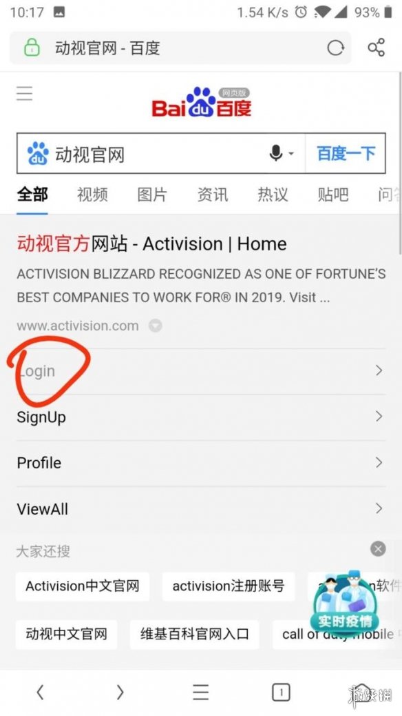 1、浏览器搜索动视官网,点击login(也可以直接进去了再找登录框)。