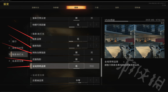武器阴影:使你的武器拿在手里时,视阳光不同有阴影,更富有立体感,想让手里的枪更真实的,可以开一下,否则关闭。
