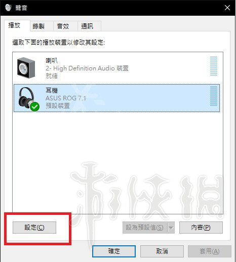 请在音效,也就是你的右下角小喇叭按右键"小喇叭">"音效",然后在你的预设声音输出装置那边选"设定":