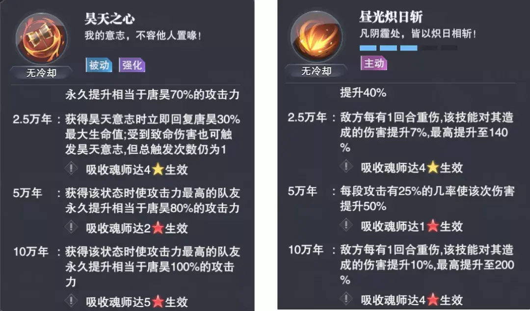 这里首先例如强攻系魂师中的唐昊和千仞雪,唐昊的2技能【昊天之心】的10万年效果是提升唐昊100%的攻击力,而5万年魂环效果则为提升80%的攻击力,这20%攻击力的差别参考大家普遍强攻系魂师的练度,还是比较可观的。