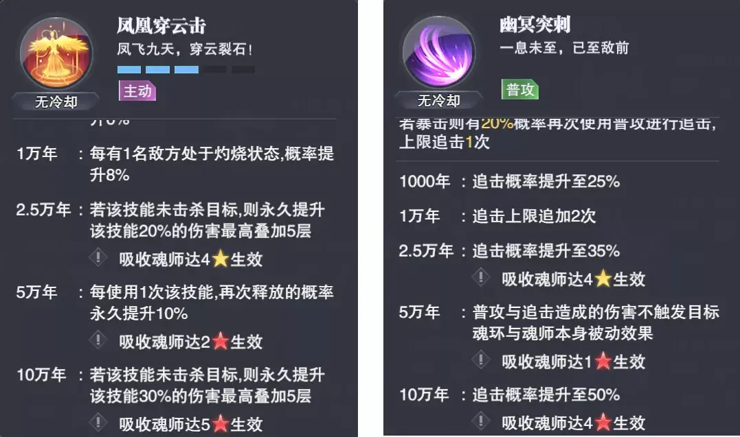 接着胖子的1技能【凤凰穿云击】也是同样的道理,10万年可以最高增伤150%,而2.5万年魂环的效果为最高100%,这50%的伤害差距也是比较大的;而针对大家常用的猫而言,普攻的基础就是3-1技能【幽冥突刺】,这里10万年的效果是追击概率提升至50%,而2.5万年的效果为35%,大家可千万不要小看了这15%的差距,在1次追击和2次追击上,同时考虑猫每场战斗的超高频率普攻,这种看似微笑的差距往往会对最后的结果产生蝴蝶效应般的影响。