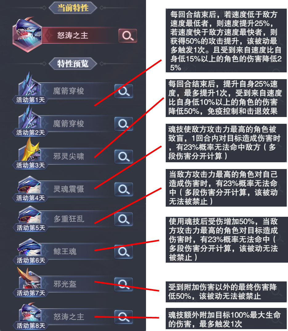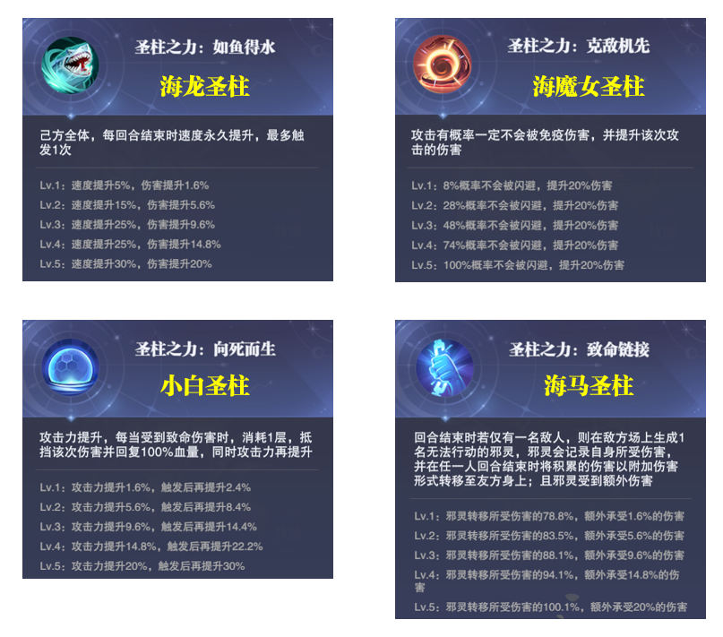 4位圣柱分别在击败后会对应赋予4种圣柱之力,其中简单说海龙斗罗对应速度和攻击的提升,海魔女斗罗对应攻击命中和伤害提升,海马斗罗对应生成1个邪灵和伤害转移,最后的小白则对应1次免死且恢复血量和攻击力提升