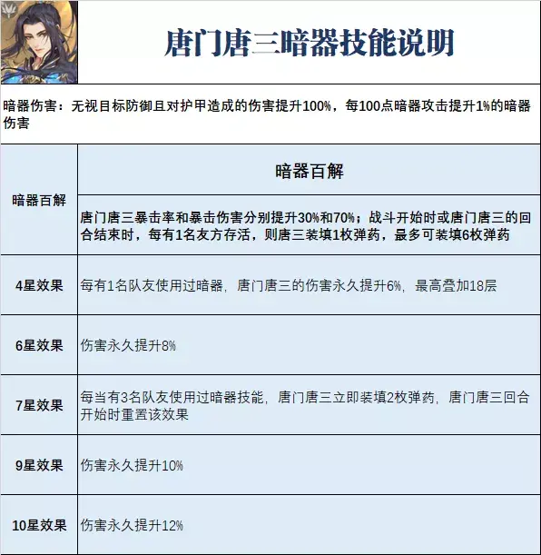 每有1名队友使用过暗器技能,暗三的伤害都会永久提升,最高在10星状态下可提升216%