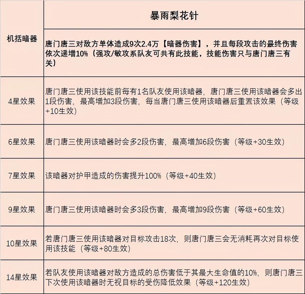 刚刚我们讲到的【暗器百解】中说到暗三1回合理论上最多可以装填8枚弹药,而配合到暗三+3名强攻/敏攻队友则刚好是1回合内4次使用【暴雨梨花针】,并且当有3名队友在暗三行动之前使用过此技能,暗三还可以最多提升9段伤害,最终就是9+9=18段伤害,并且在【暴雨梨花针】10星的效果下,暗三在18段攻击后还能无消耗自动释放一次【暴雨梨花针】,因此大家想要在悬赏中用暗三打出高伤害,至少7星的暗三+10星且80级的【暴雨梨花针】是一个质变的门槛