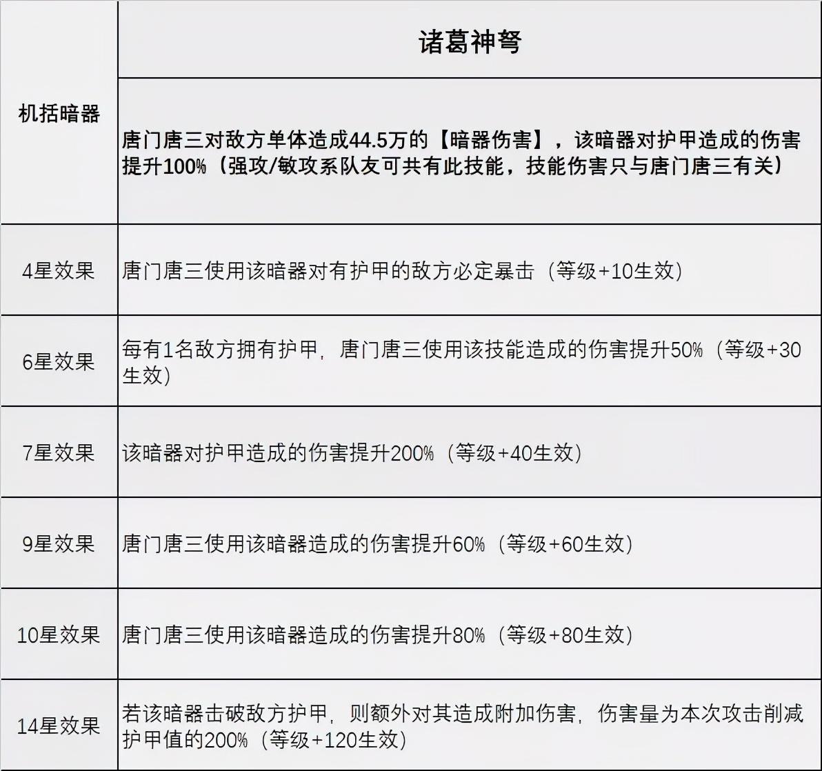 接着我们看到的是暗三的另一个单体输出暗器【诸葛神弩】,相对于【暴雨梨花针】的单体爆炸输出而言,【诸葛神弩】的特点是对有护甲的敌方会造成更加可观的伤害,因此算上对护甲目标必定暴击、按照对方拥有护甲的数量来进行增伤、对护甲敌人的额外伤害提升、击破护甲后的额外附加伤害等因素,维一认为【诸葛神弩】应该在PVP中会有不错的效果和发挥,特别对于拥有护盾和防御超高的敌人来讲,【诸葛神弩】的伤害应该会有奇效,毕竟暗器伤害本身就是无视防御的。